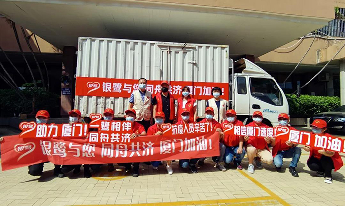 在切實做好廠區(qū)防疫、環(huán)境消毒、個人防護等的基礎(chǔ)上,銀鷺還主動同當?shù)卣嘘P(guān)部門和紅十字會對接,克服交通物流不暢、人員緊缺等困難,為醫(yī)院、街道、社區(qū)、學校、核酸檢測點、交通檢查卡口等送達了銀鷺產(chǎn)品,緩解物資缺乏的燃眉之急。同時,銀鷺黨員和志愿者300 多人主動參加檢測點及卡口值守、隨車搬運捐贈物品等工作。